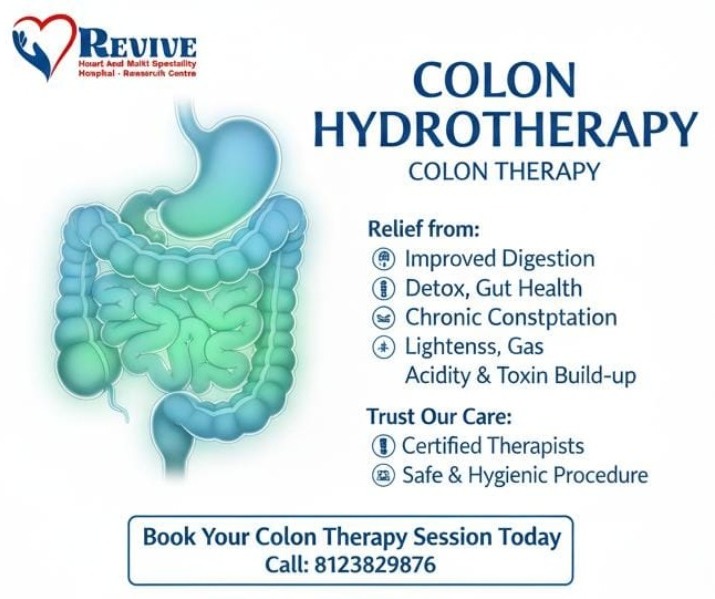 ಮೈಸೂರಿನಲ್ಲಿರುವ ಹೆಬ್ಬಾಳದ ರಿವೈವ್ ಹಾರ್ಟ್ & ಮಲ್ಟಿ ಸ್ಪೆಷಾಲಿಟಿ ಆಸ್ಪತ್ರೆಯಲ್ಲಿ ಸೌಮ್ಯ ಮತ್ತು ಪರಿಣಾಮಕಾರಿ ಕೊಲೊನ್ ಹೈಡ್ರೋಥೆರಪಿಯನ್ನು ಅನುಭವಿಸಿ. ನಮ್ಮ ಕೊಲೊನ್ ಚಿಕಿತ್ಸೆಯು ಜೀರ್ಣಕ್ರಿಯೆ, ಕರುಳಿನ ಆರೋಗ್ಯ, ನಿರ್ವಿಶೀಕರಣವನ್ನು ಸುಧಾರಿಸಲು ಸಹಾಯ ಮಾಡುತ್ತದೆ ಮತ್ತು ದೀರ್ಘಕಾಲದ ಮಲಬದ್ಧತೆ, ಅನಿಲ, ಉಬ್ಬುವುದು, ಆಮ್ಲೀಯತೆ ಮತ್ತು ವಿಷದ ಶೇಖರಣೆಯಿಂದ ಪರಿಹಾರವನ್ನು ನೀಡುತ್ತದೆ.
