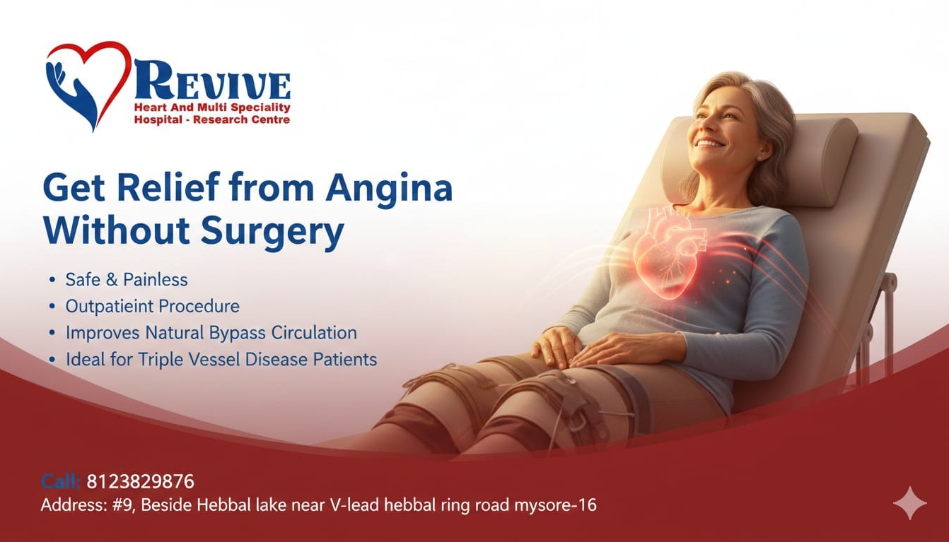 Looking for non-surgical treatment for angina in Mysore? Revive Heart & Multi Speciality Hospital – Research Centre, located beside Hebbal Lake near V-Lead Ring Road, Mysore-16, offers advanced EECP (Enhanced External Counter Pulsation) Therapy for patients suffering from angina and triple vessel coronary artery disease.