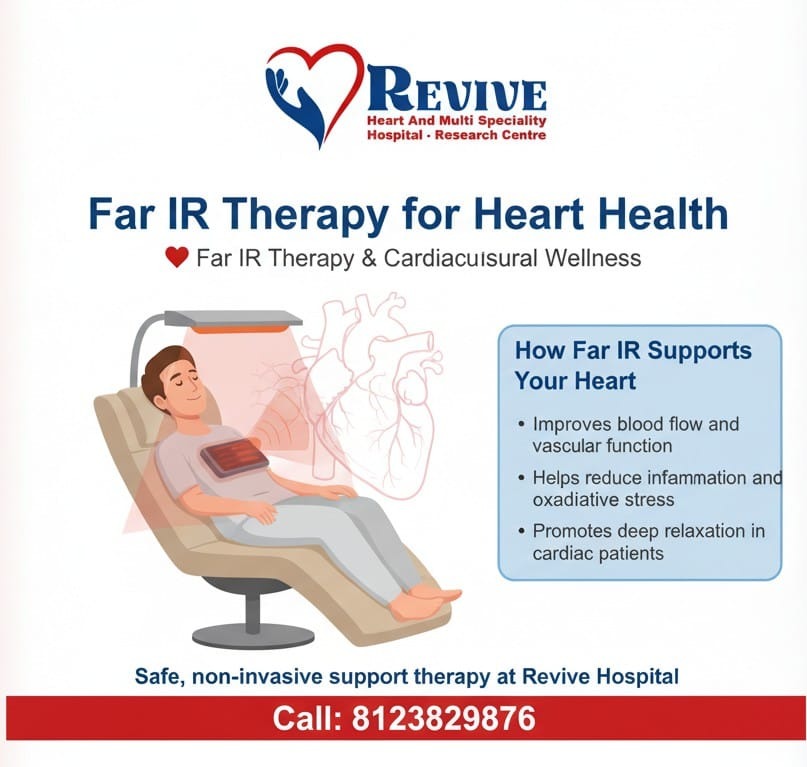ರಿವೈವ್ ಹಾರ್ಟ್ & ಮಲ್ಟಿ ಸ್ಪೆಷಾಲಿಟಿ ಆಸ್ಪತ್ರೆಯಲ್ಲಿ Far IR Therapy ಒಟ್ಟಾರೆ ಹೃದಯ ಆರೋಗ್ಯ ಮತ್ತು ಹೃದಯ ಕ್ಷೇಮವನ್ನು ಹೆಚ್ಚಿಸಲು ವಿನ್ಯಾಸಗೊಳಿಸಲಾದ ಸುರಕ್ಷಿತ, ಆಕ್ರಮಣಶೀಲವಲ್ಲದ ಬೆಂಬಲ ಚಿಕಿತ್ಸೆಯಾಗಿದೆ.