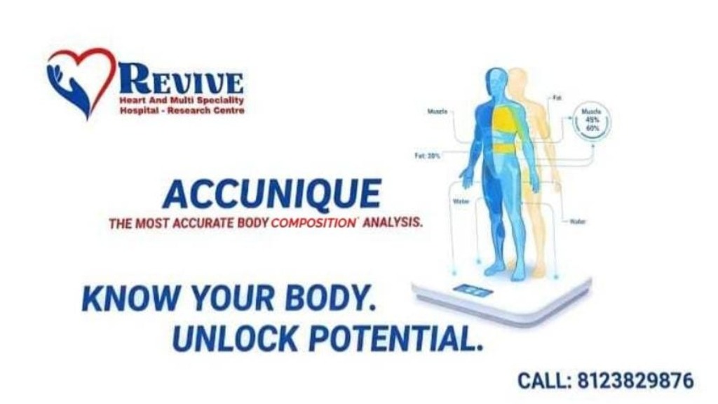 Ideal for weight management, fitness planning, lifestyle disease prevention, and health monitoring, Accunique helps you make informed health decisions. Know your body better and unlock your true potential with expert guidance at Revive Hospital.