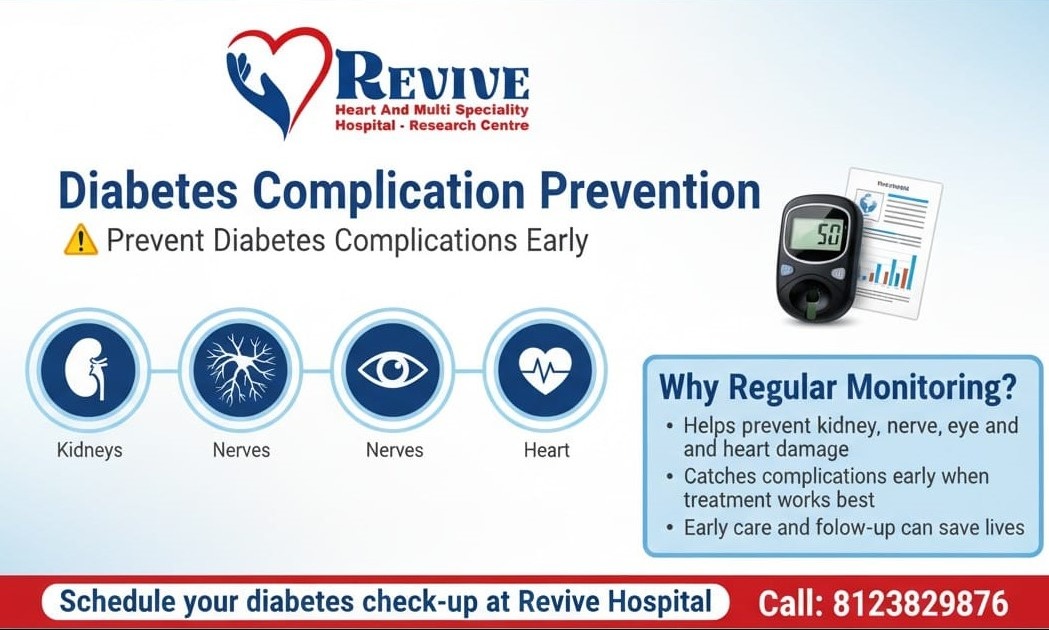 ಮೈಸೂರಿನ ಹೆಬ್ಬಾಳದಲ್ಲಿರುವ ರಿವೈವ್ ಹಾರ್ಟ್ & ಮಲ್ಟಿ ಸ್ಪೆಷಾಲಿಟಿ ಆಸ್ಪತ್ರೆಯಲ್ಲಿ ಮಧುಮೇಹ ತೊಡಕು ತಡೆಗಟ್ಟುವಿಕೆಗೆ ತಜ್ಞರಿಂದ ನಿಮ್ಮ ಮೂತ್ರಪಿಂಡಗಳು, ನರಗಳು, ಕಣ್ಣುಗಳು ಮತ್ತು ಹೃದಯವನ್ನು ರಕ್ಷಿಸಿಕೊಳ್ಳಿ.